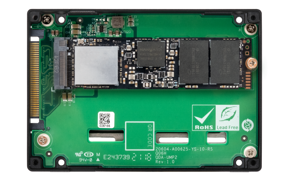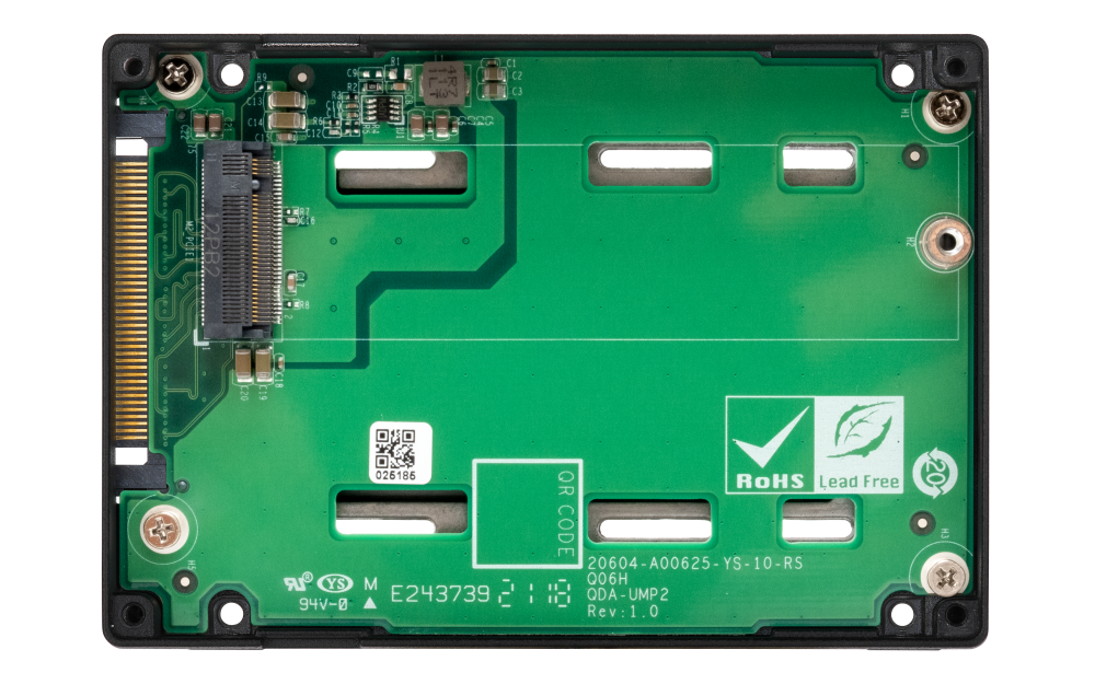 QDA-UMP4 cho phép lắp đặt ổ SSD M.2 PCIe 4.0 x4 NVMe trong khoang ổ SSD PCIe 4.0 x4 NVMe U.2 2,5 inch (SFF-8639). Không cần phần mềm hoặc trình điều khiển bổ sung nào cho QDA-UMP4 và có thể lắp đặt trong PC/máy trạm (Windows®, Linux®) hoặc QNAP NAS để có thể sử dụng ổ SSD M.2 như giải pháp thay thế tiết kiệm chi phí cho ổ SSD U.2 đắt tiền.